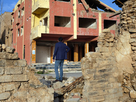 IRAQ. Sinjar. March 3, 2018. The ruins of a building destroyed during the fight against ISIS in Sinjar, northern Iraq. More than two years after the liberation of Sinjar, this war-ravaged city remains mostly in ruins.
