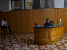 USA. Princeton, NJ. 2018. Laura Wooten, 97 years old, at the dining hall at Princeton University where she works checking student IDs. She has also worked at the voting polls for 79 consecutive years.