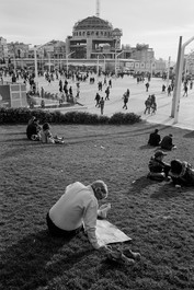 TURKEY. Istanbul. 2018. People rest in Gezi Park near the construction of a giant mosque in the heart of Istanbul, in the historic Taksim square (plans for a mosque at Taksim have been discussed for decades)