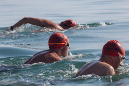 Turkey. Canakkale. 2018. Telegraph magazine reporter Alex Preston swims (center) from European side to Asian side near Dardanelles.