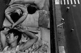 USA. New York City. 1998. Immigrants sleeping on a fire escape to avoid summer heat.