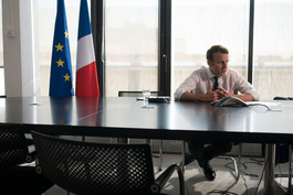 FRANCE, Paris, 2017/04/20. Emmanuel Macron, leader of the "En Marche" movement and French Presidential candidate at his campaign headquarters in the 15th arrondissement. On a call with former US President Barack Obama.