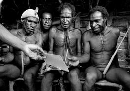 INDONESIA. Irian Jaya. 1989. Members of the Dani Tribe look at pictures from 1959. Robert GARDNER, American filmmaker, Director of "Dead Birds" returned to Irian Jaya 30 years after the making of his film about the Dani tribe.