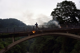 Japanese men swing pieces of burning hay from the main bridge in the village of Nanmoku during the traditional Oobinata Hitoboshi Obon Festival.