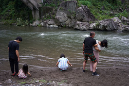 Local tourists by the banks of the Nanmoku River during the Obon holiday in Gunma Prefecture.