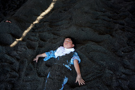 7-year-old Kantaro Uemoto, from Fukuoka City, is buried under medicinal sand, along with other members of her family, during a visit to a popular sand bathing spa on the beach in the southern Japanese town of Ibusuki, Kagoshima Prefecture.