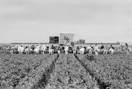 USA. CALIFORNIA. Fertile area between San Juan and Hollister where in a huge Brocolli field is harvested by migrant Mexican workers. 1991