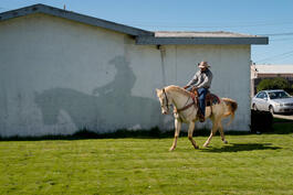 USA. Vallejo, CA. 2017. Luiz rides his horse through the city to Townhouse bar on his day off work.