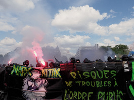 FRANCE. Paris. 1 May 2018. May Day demonstration. Thousands of demonstrators marched across Paris during May Day, joined by protesters from far-left anarchist group Black Blocs.