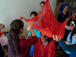 AZERBAIJAN, Lerik. 2018. People dance around Terane Sahverdiyeva, 17 during her henna ceremony in Zarikumecu village. Talysh people gather for henna night a day before the wedding ceremony.