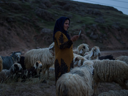 IRAN. Khuzestan. 2018. A Nomad woman checking her mobile phone between her flock.