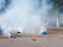 FRANCE. Paris. 1 May 2018. Labour union's May Day rally. Thousands of demonstrators marched across Paris during May Day. Police uses water cannons and tear gas against the participants.