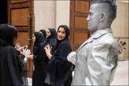 United Arab Emirates. Sharjah. Xposure International Photography Festival is the first official Sharjah photography educational and imaging platform that combines a broad range of photography events including exhibitions, workshops, seminars, presentations, competitions, photo walks and a photographic product trade show. Here at a banquet in Sharjah's beautiful banqueting hall, they amuse people arriving. 2016