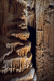 France. Lot. Cabrerets. Pech Merle is a cave which opens onto a hillside in the Occitania region in France, east of Cahors. The caves and caverns were originally created by rivers rushing through the rocks. Pech Merle is one of the few prehistoric cave painting sites in France that remain open to the general public. Extending for more than a mile from the entrance are caverns, the walls of which are painted with dramatic murals dating from the Gravettian culture - about 25,000 years BC. Some of the paintings and engravings, however, may date from the later Magdalenian era - 16,000 years BC. Shown here are stalactites formed from mineral deposits over millennia. The steady deposits over thousands of years have created wonderful columns and this stack of fringed pancake stalactites. 2016