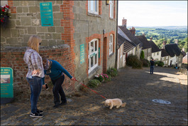 GB. England. Dorset. Shaftesbury. A woman drags a reluctant dog on Gold Hill, the scene of the famous Hovis bread advert. 2016