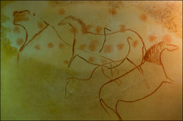 France. Lot. Cabrerets. Pech Merle is a cave which opens onto a hillside in the Occitania region in France, east of Cahors. The caves and caverns were originally created by rivers rushing through the rocks. Pech Merle is one of the few prehistoric cave painting sites in France that remain open to the general public. Extending for more than a mile from the entrance are caverns, the walls of which are painted with dramatic murals dating from the Gravettian culture - about 25,000 years BC. Some of the paintings and engravings, however, may date from the later Magdalenian era - 16,000 years BC. Shown here and painted in red are a lion and three horses with 17 dots of the same colour. 2016