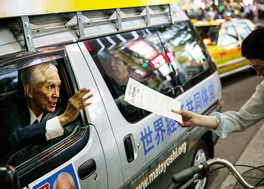 JAPAN. Tokyo. 2016. Jesus Matayoshi hands out election flyers. Jesus Matayoshi was born in Okinawa, Japan in 1944. In 1997 he founded the World economic Community Party, which bases its policies on Matayoshi’s identity as Jesus Christ reborn. Matayoshi, also known as The Only God, will bring about the end times and God’s Kingdom through the democratic political process. He has run for of ce in most Japanese elections for the last two decades. According to his election materials he will first become prime minister of Japan and reform Japanese society. The next step is to be offered the post of Secretary General of the United Nations. From these positions he will reign over the whole world, instituting God’s law. Most recently Jesus Matayoshi campaigned for a Tokyo seat in the Upper House of Councilors in the Japanese parliament in July 2016. Matayoshi is famous for his vigorous campaign style, where he instructs his opponents to commit suicide and threatens hell re upon sinners. While the 6114 votes he got did not earn him of ce this time, Matayoshi ghts on until the time is right.