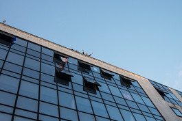 FRANCE, Paris, 2017/4/23. Emmanuel Macron greeting his supporters from the rooftop of "En Marche" headquarters, in the 15th arrondissement.