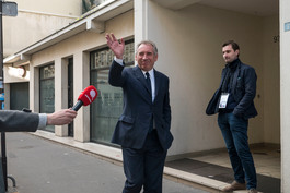 Centrist François Bayrou, Emmanuel Macron's main backer joins him at "En Marche" headquarters right before the results announcing Macron will compete for the second round against M.LePen, FN.