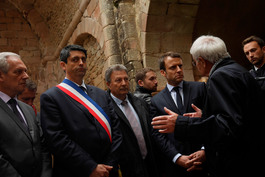 FRANCE. Oradour-sur-Glane. April 28, 2017. Emmanuel MACRON visited the village of Oradour-sur-Glane, where the presidential candidate paid his respects to the 642 victims of the 1944 massacre.