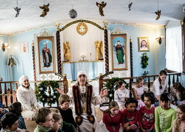 RUSSIA. Krasnoyarsk Territory. 2015. A Vissarionite priest hold a children’s service in the Vissarionite village of Sheremshanka. In 1988 the man born as Sergei Torop lost his job as a traffic policeman in the Siberian town of Minusinsk. Shortly afterwards, just as the Soviet Union unraveled around him, he had his first revelations that he was Jesus Christ. He founded the Church of the Last Testament in the early 1990s. People flocked to him from all corners of the Russian empire and founded an off-the-grid utopian eco-village in the Siberian wilderness, the Abode of Dawn. The community now numbers around five thousand dedicated followers. They have built their own schools, churches, formed a priesthood and their own social structure. Vissarion’s right-hand disciple, Vadim, is always close by and records all Vissarion’s deeds and proclamations. The resulting chronicles are continuously published in thick Russian-language tomes titled Pozledniy Zavet, or The Last Testament. They are currently on volume sixteen.