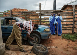 ZAMBIA. Kitwe. 2016. Jesus of Kitwe changing the tires on his...