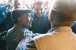 FRANCE, Poitiers. April 29, 2017. Emmanuel Macron, "En Marche" presidential candidate campaigning at the market.