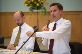 GB. England. Godalming. 28th May 2017. Hustings at the Godalming Baptist Church. Jeremy Hunt - Health Minister - speaking - is opposed by Louise Irvine for the National Health Action Party. In this picture Hunt on right and UKIP's Martin Webber (left)