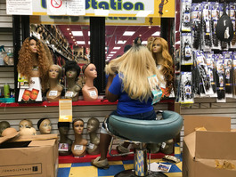 USA. Harlem, NYC. 2017. Wig collection at Apollo Beauty Land supply store.