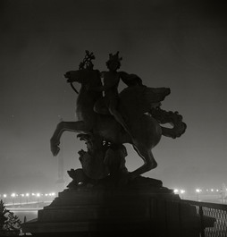 FRANCE. Paris. Tuileries. Nightime view from the Tuileries to the place de la Concorde with the marble statue of Hermes riding Pegasus created by Antoine Coysevox. Winter 1936 / 1937.