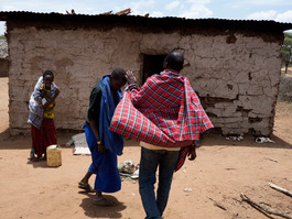 TANZANIA, Arusha Region, Longido area 2018/02. Maasai husband of two wifes. He was evicted by a combination of government and commercial deal, by force and his hut destroyed. Had to move 10km inland. But also is successfully involved in the ruby business and has been able and continues building a house, restaurant etc. in the center of the booming village. In 2016/4 ruby was discovered in the village of Mundarara, a traditional poor Maasai grazing area. Since then there has been a boom of ruby exploration, locals and arriving traders, but also an increase in evictions from the land where ruby can be found.