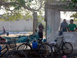 SRI LANKA. Jaffna. January, 2018. Bullet holes riddle the ruins of a building, now used by fishermen, damaged during the civil war in the port city of Jaffna, northern Sri Lanka.
