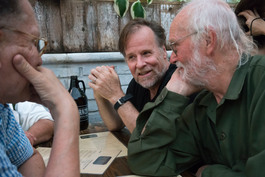 USA. New York. Magnum Photos annual meeting. Relaxing at a bar. Antoine van Agtmael, Alex Webb, Josef Koudelka. 2017