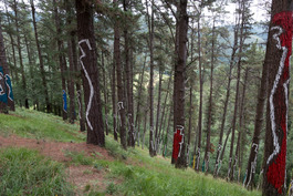 Spain. Basque Country. Near Guernica. 2017. The Painted Forest of Oma. The pines in the Oma forest, in a remote part of Spain were turned into Land Art by the Basque artist Agustín Ibarrola in 1982. He used a rustic ladder to fill the forest with motifs from culture and "our collective feeling". The work was completed in 2000. In the past year the region has been repainting and renovating Ibarrola's vision.