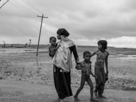 BANGLADESH. Teknaf. October 12, 2017. A recently arrived Rohingya woman and her children walk toward a Bangladeshi police checkpoint outside of Teknaf, a Bangladeshi town across the Naf River from Bangladesh.