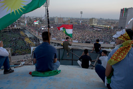IRAQ, Erbil. People wave Kurdish flags during a rally for the...