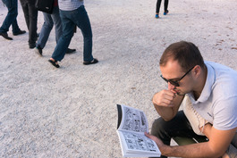 France. Paris 75006. Luxembourg Gardens. Serious reading, with foot. 2017