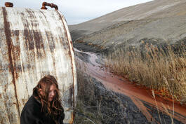 USA. Illinois. 2017. Georgia de la Garza, a local environmental activist in Southern Illinois looks at Mercury run off by an active mine. Mining jobs have been the core of the economy in Southern Illinois for the past century, a source of stability, prosperity and pride. In the last few decades the number of jobs have declined to a small fraction of their former number, leaving the economy in shambles with few prospects for new forms of industry to take its place.