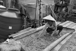 Malaysia. Sarawak. 2018. Indigenous land rights. Kampong Sebayong longhouse in Belawai near where a blockade is up protesting again palm oil plantation and a Halal meat hub. Women plant rice for domestic consumption.