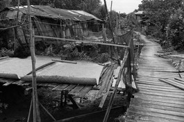 Malaysia. Sarawak. 2018. Indigenous land rights. Kampong Sebayong longhouse in Belawai near where a blockade is up protesting again palm oil plantation and a Halal meat hub. Women plant rice for domestic consumption.