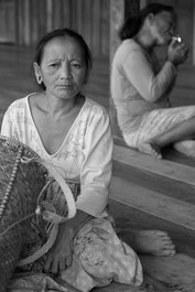 Malaysia. Sarawak. 2018. Indigenous land rights. Mujan, a Penan, at the Talun longhouse, near Asap, Belaga. Julan smokes a handmade cigarette in the background.