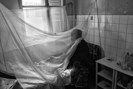 Africa. Niger. Diffa. 2017. Kime Mouse (22) tries to comfort her daughter Tije (2) on the bed in Diffa Regional Hospital. Tire's body is 40% burned after the fire in Kabi refugee camp.