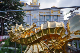 A huge golden sea-horse, part of the Imperial Casino and Hotel's decorative facade, is stored at a staging area near the casino in Garapan.