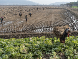 Farmers collecting rice straw after the harvest; Chongsan-ri Cooperative Farm, Nampo. In rural Korea, virtually every square metre of arable land is cultivated; little is put to waste.