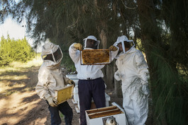 TUNISIA. Siliana. July 2017. Installation and control of 40 beehives, as part of an integrated project of grenadier plantation and honey production.