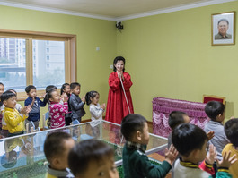 Class time; Changgwang Kindgergarten, Pyongyang. Every Korean classroom has a portrait of President Kim Il Sung and Leader Kim Jong Il.