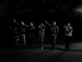 Members of La Falange, a far right political movement, outside the Valle de Los Caidos. The law prevents them from entering the Valle de Los Caidos so they carry out their cerimony in the parking lot.