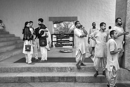 Devotees interacting with each other outside the ashram at Isha Foundation.