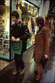 GB. England. London. Carnaby Street. 1967. A couple shop in the rain.