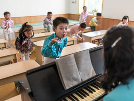 Practice makes perfect at Chongam Kindergarten in Chongjin, North Hamgyong Province. Korean children are expected to learn how to sing and dance from a young age.